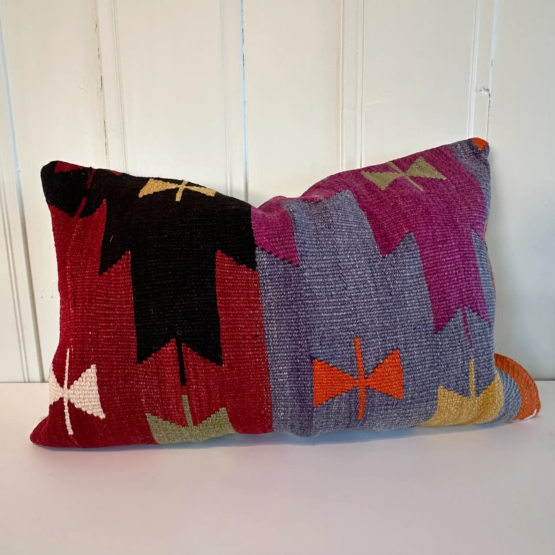 Dette er en rustikk og vakker kelimpute som er laget av plantefarget ull.  En kelimpute tilfører rommet en etnisk atmosfære og den skaper en god og varm stemning. Legg den i sofaen, på en benk eller på gulvet foran peisen. Den er vakker som etnisk tilsnitt til den nordiske stilen og tilfører rommet klasse.  Dette er et unikt produkt, så samme pute vil du ikke finne igjen andre steder.