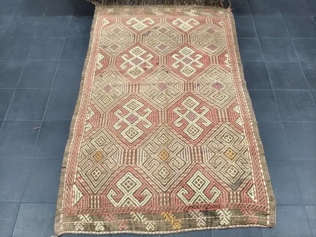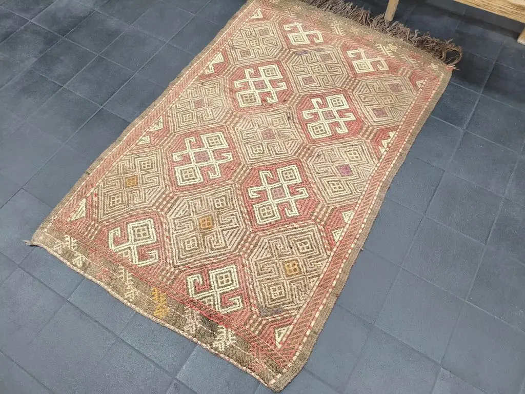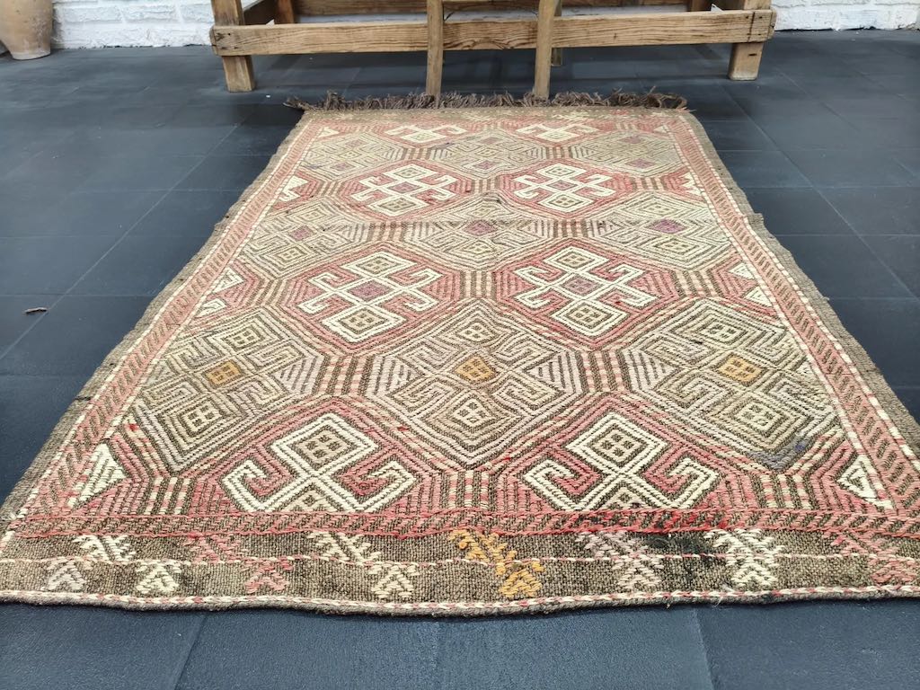 Dette kelimteppet er et vakkert nomadeteppe, flatvevd kelim. Teknikken i etterkant er brodering på vev.