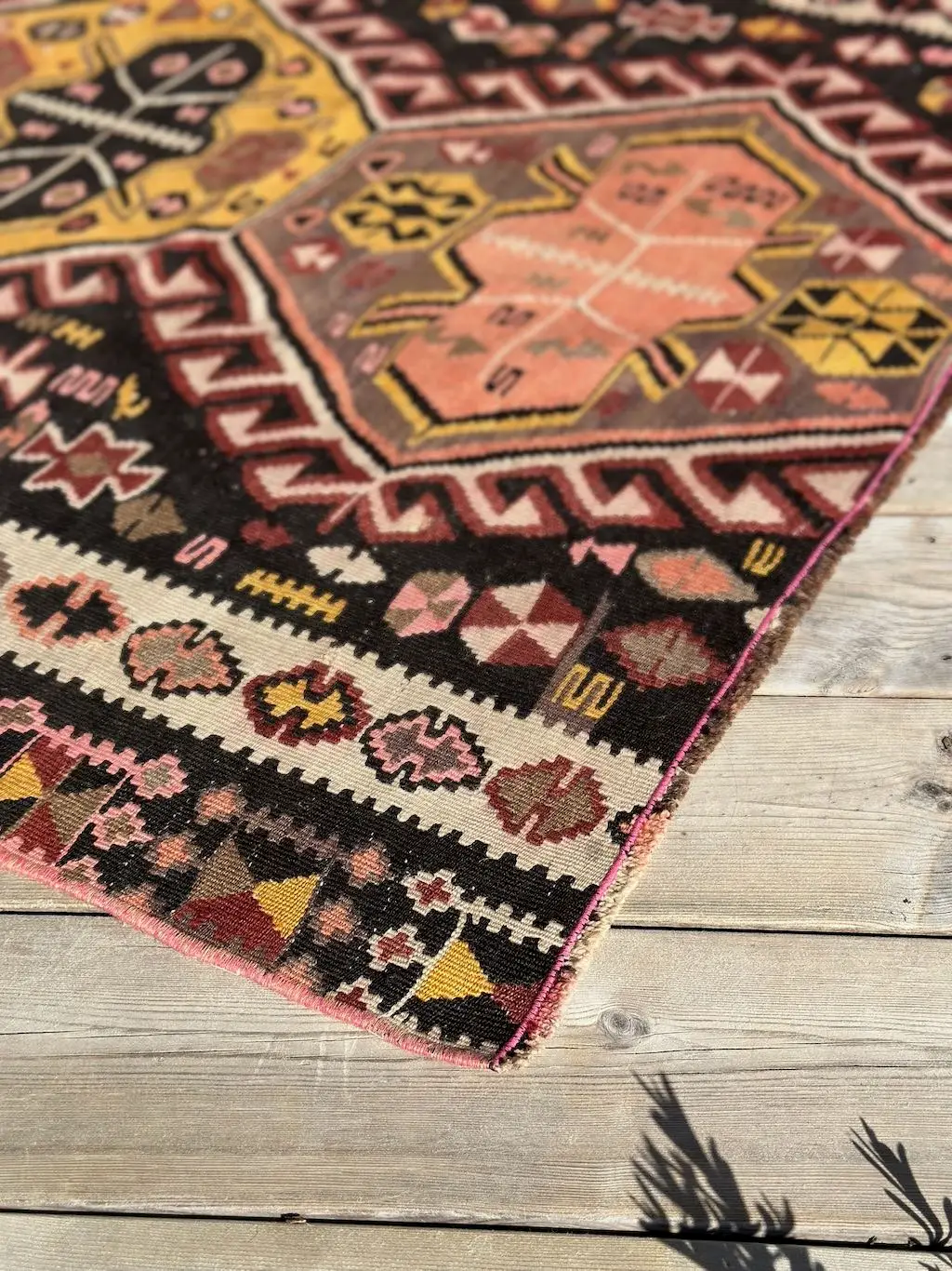 Kelimtepper fra Anatolia er kjent for sin unike veveteknikk, sterke ullkvalitet og geometriske mønstre – og dette teppet er intet unntak. Fargene har fått en naturlig patina over tid, som gir en mykhet og varme du ikke finner i nye tepper.