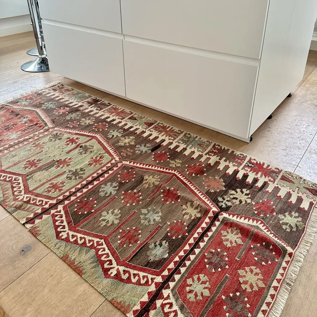 Størrelse på kelimteppet er 180 x 90 cm, noe som gjør den perfekt for både store og små rom.