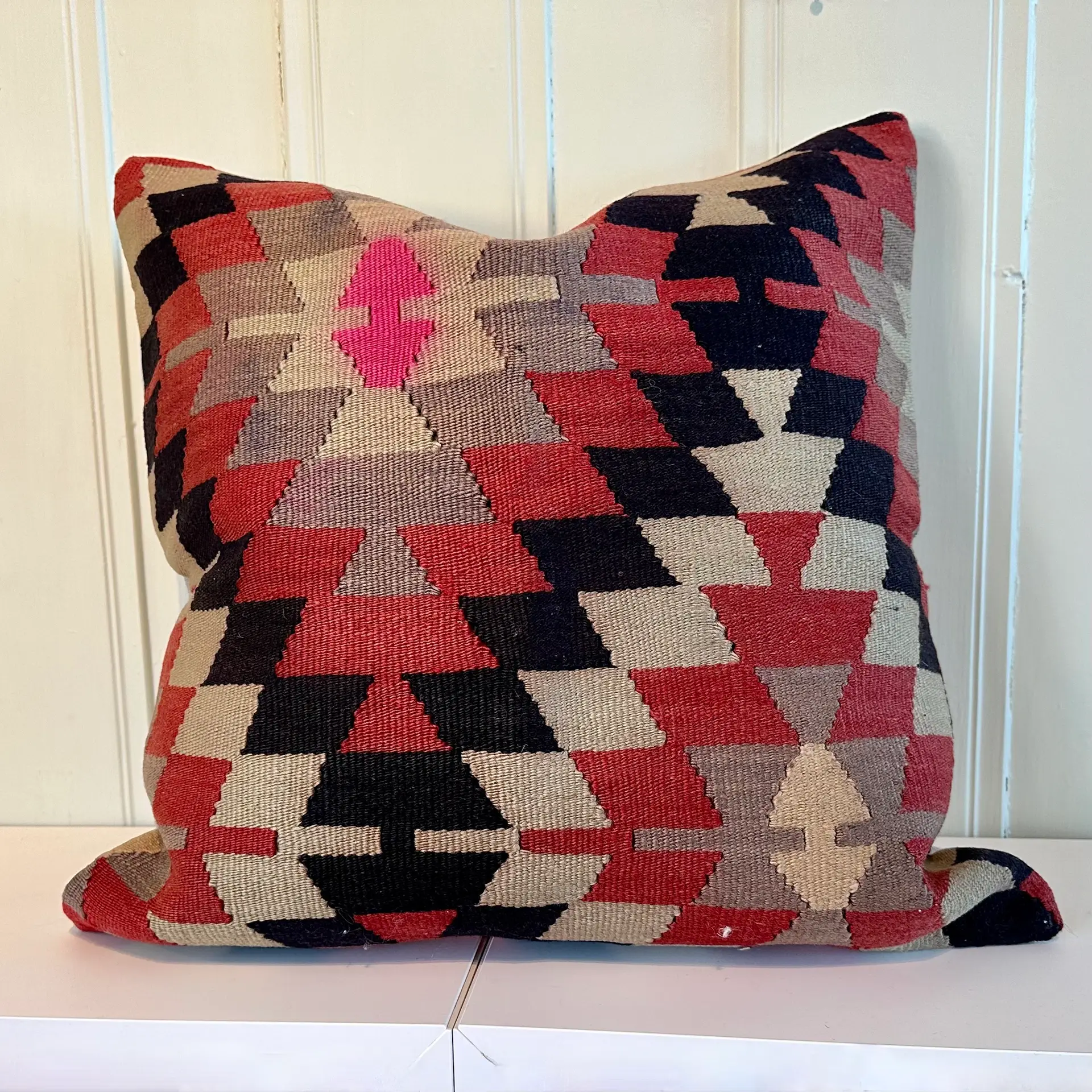 Dette er en rustikk og vakker kelimpute som er laget av plantefarget ull.  En kelimpute tilfører rommet en etnisk atmosfære og den skaper en god og varm stemning. Legg den i sofaen, på en benk eller på gulvet foran peisen. Den er vakker som etnisk tilsnitt til den nordiske stilen og tilfører rommet klasse.  Dette er et unikt produkt, så samme pute vil du ikke finne igjen andre steder.