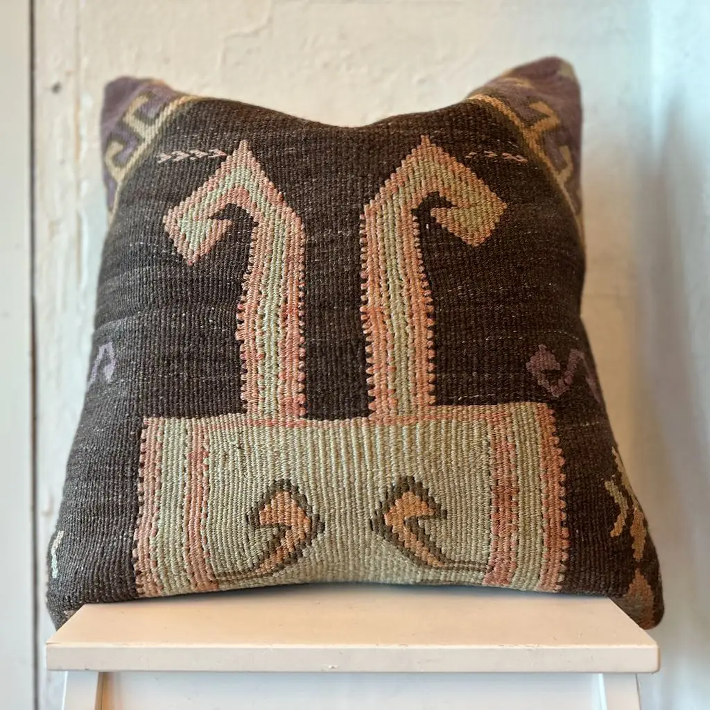 Lekker kelimpute i plantefarget ull. Puten vil være et blikkfang i rommet, enten det er i sofaen, på benken i gangen eller i senga på et soverom. Den vil være spennende i kobinasjon med andre kelimputer, men fungerer også godt som et «statement» alene.