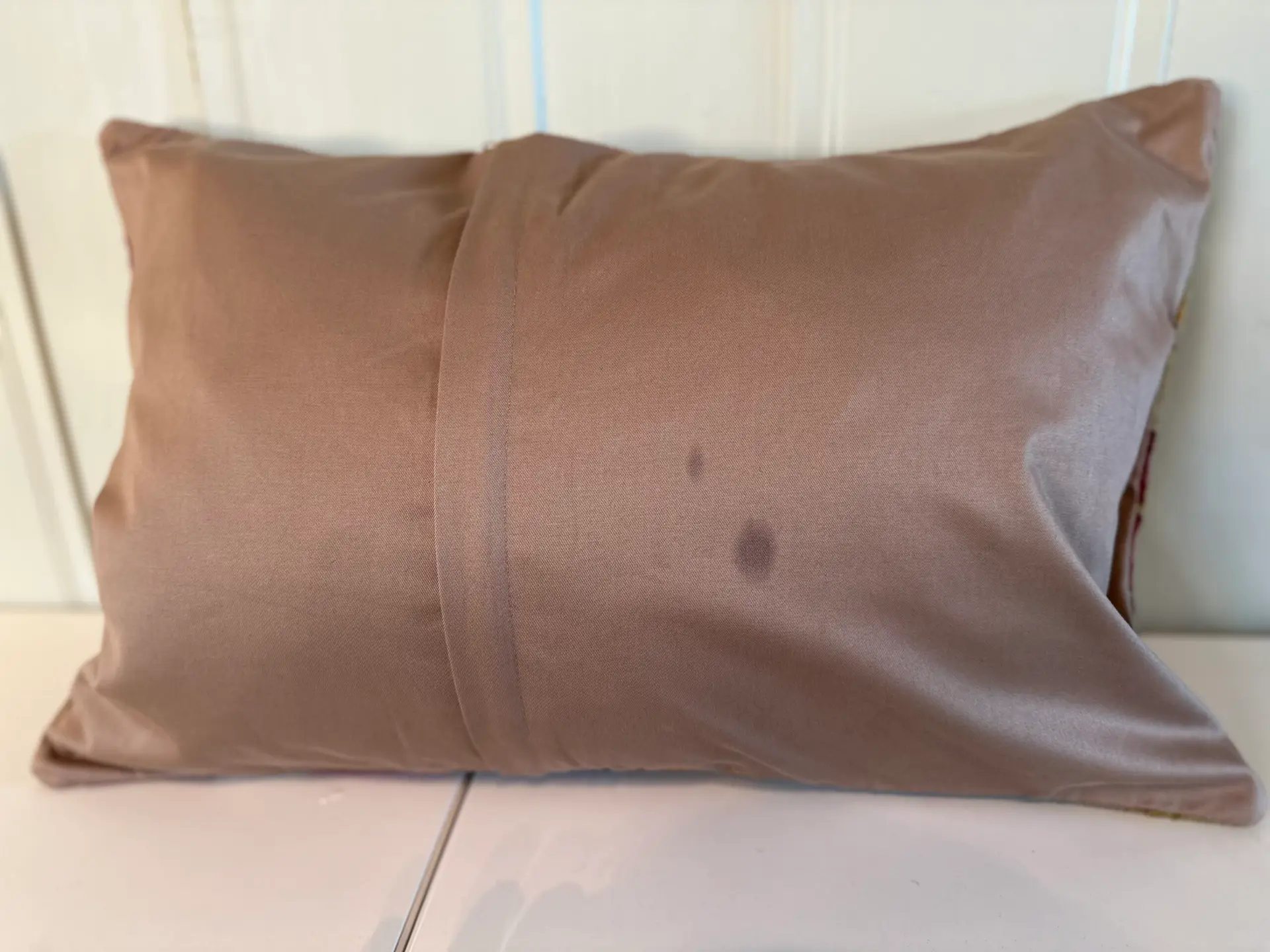 Den ene puten har en flekk på baksiden. Dette er ikke synlig når den ligger i sofaen eller stolen.
