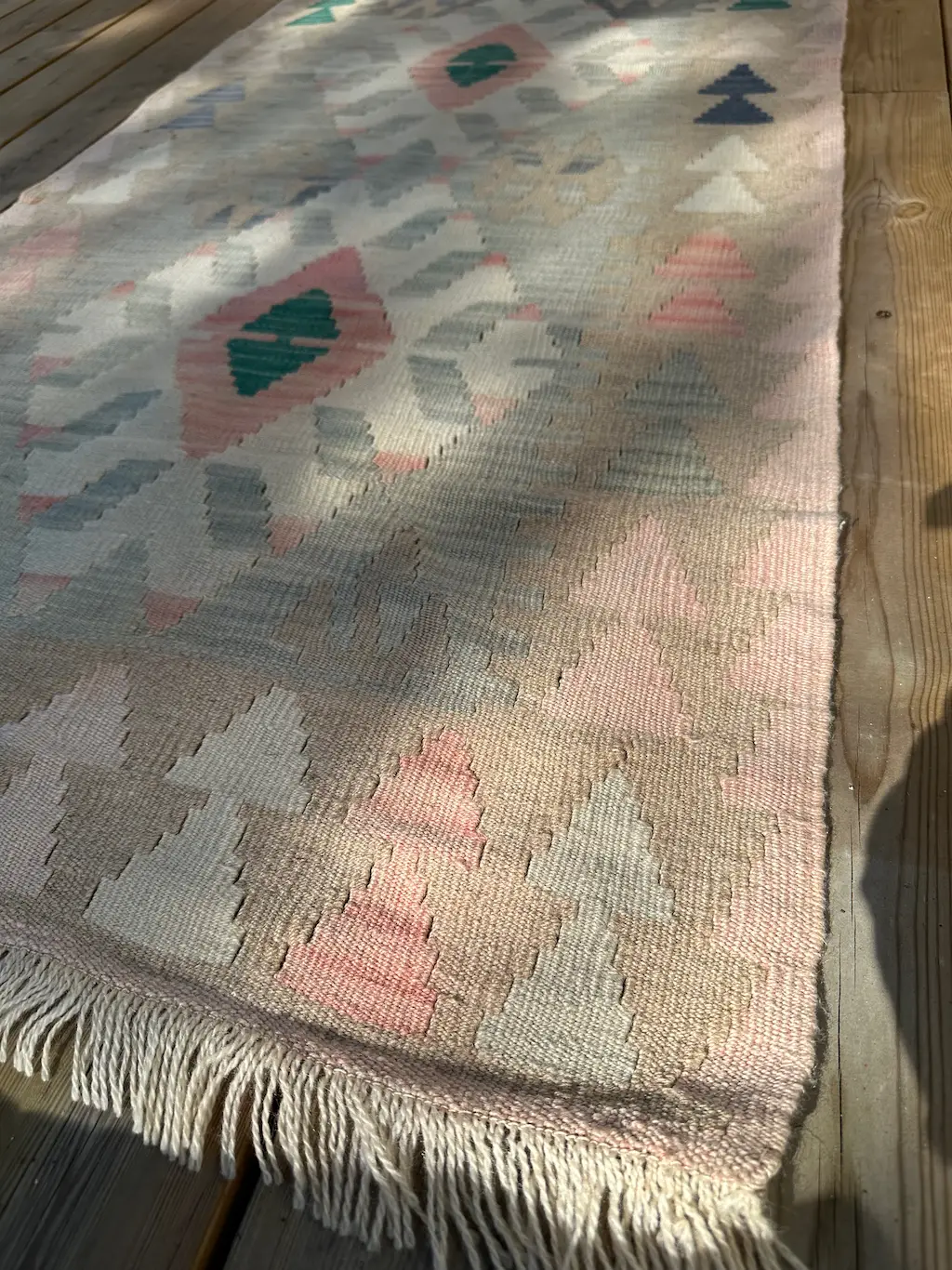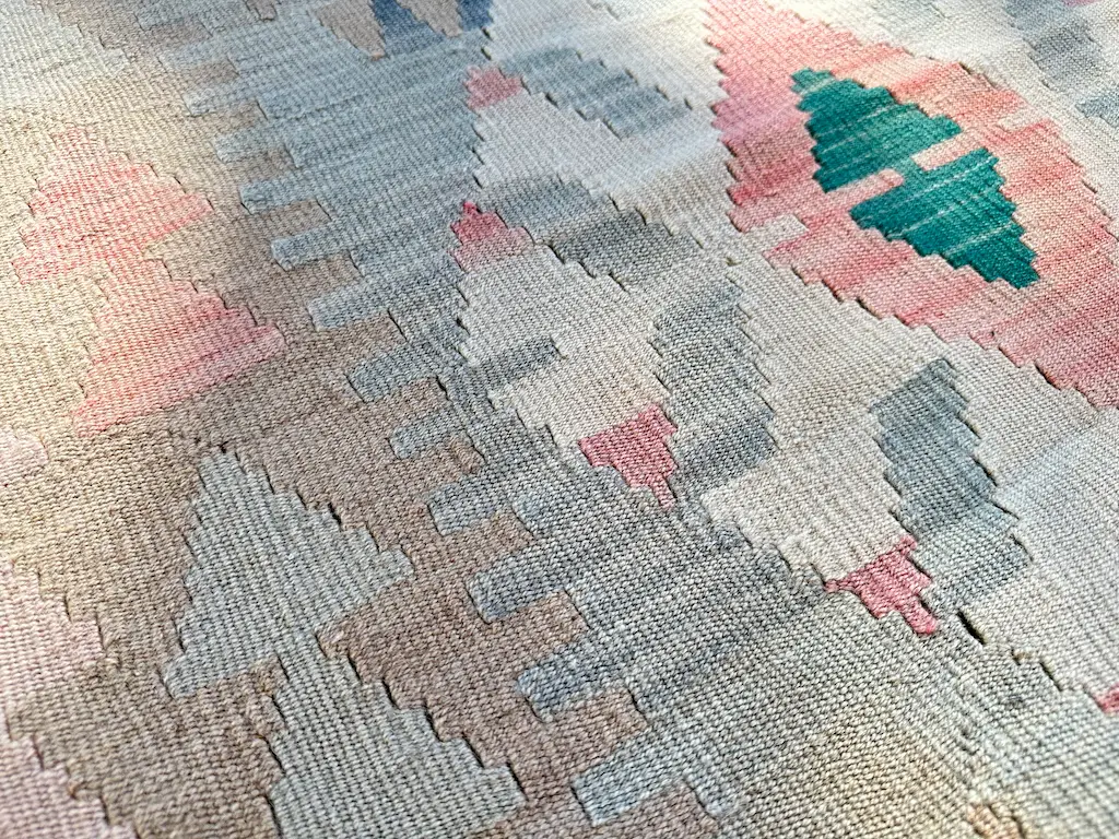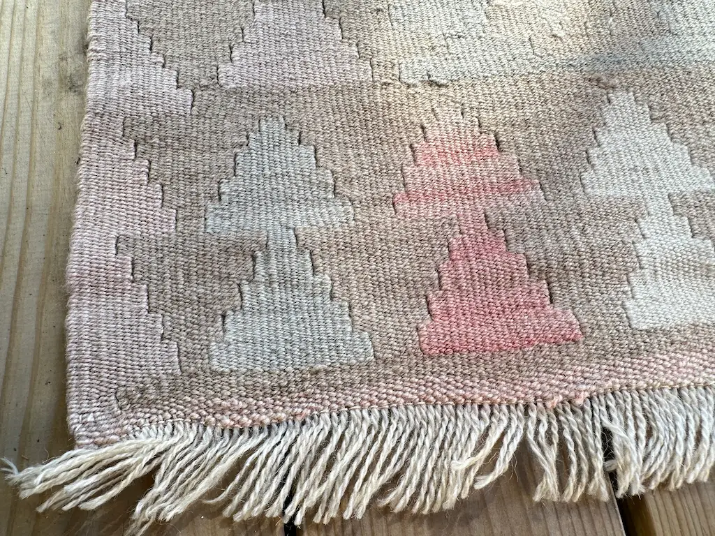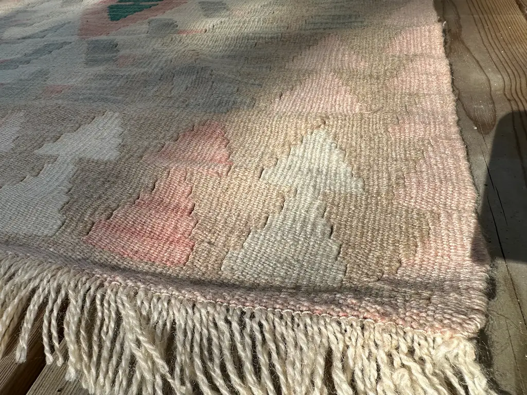 Dette er en sart pastellfarget kelimløper som forsiktig legger seg som et smykke på gulvet.