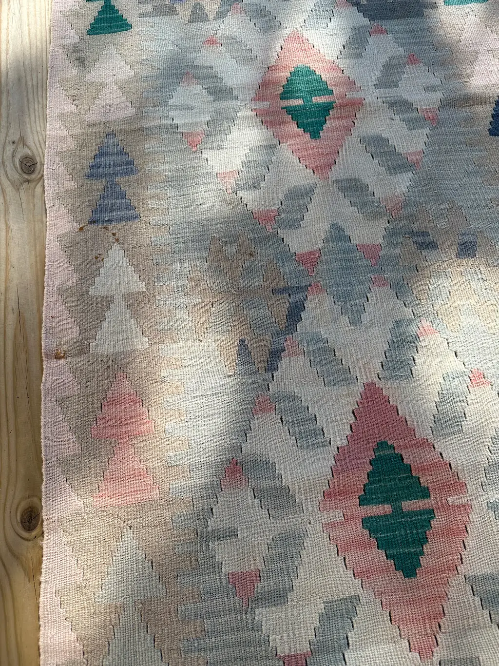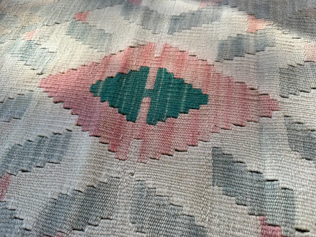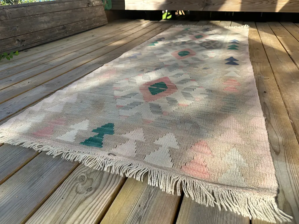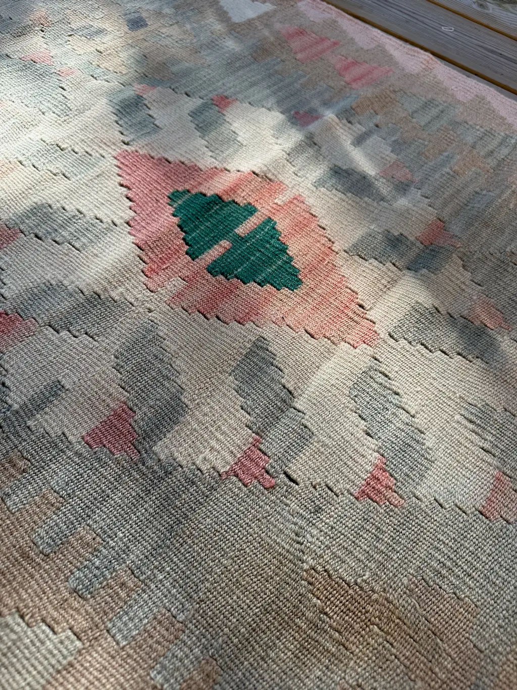 Dette er en sart pastellfarget kelimløper som forsiktig legger seg som et smykke på gulvet.