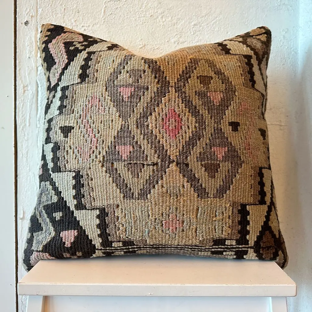 Lekker kelimpute i plantefarget ull. Puten vil være et blikkfang i rommet, enten det er i sofaen, på benken i gangen eller i senga på et soverom. Den vil være spennende i kobinasjon med andre kelimputer, men fungerer også godt som et «statement» alene.