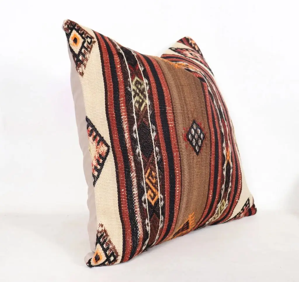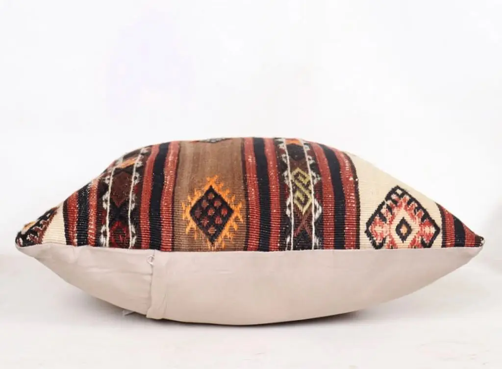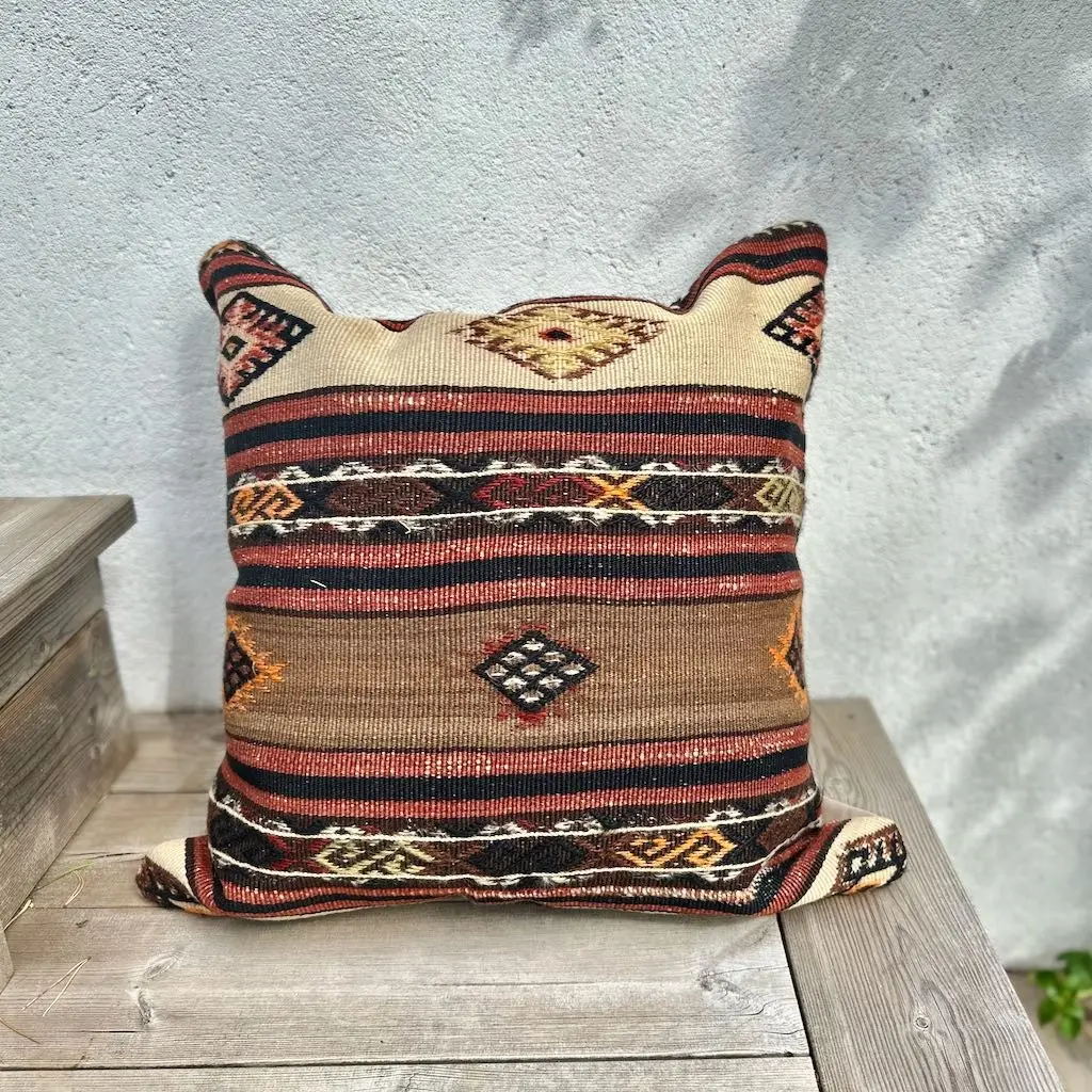 Gi hjemmet ditt et personlig og varmt preg med denne håndvevde kelimputen i 100 % ull. Putens kvadratiske fasong gjør den ideell som støttepute i sofaen, på sengen eller i en god lenestol. De vakre fargene gir et mykt og behagelig uttrykk, samtidig som de tilfører subtil farge og liv til interiøret. Hver pute er unik og bærer preg av tradisjonelt håndverk, inspirert av klassiske kelimmønstre fra Midtøsten og Sentral-Asia. Ullmaterialet er naturlig slitesterkt og pustende, og gir både komfort og lang levetid. Kelimputer passer perfekt i både moderne og bohemske hjem, og er et flott valg for deg som ønsker å kombinere estetikk med funksjonalitet. Baksiden kommer med glidelås for enkel fjerning av putetrekket. Enten du ønsker én karakteristisk pute eller vil mikse flere i ulike fargetoner og mønstre, vil denne kelimputen i ull bli et blikkfang i ethvert rom. Kombiner gjerne med tepper og tekstiler i naturmaterialer for et helhetlig og harmonisk interiør.