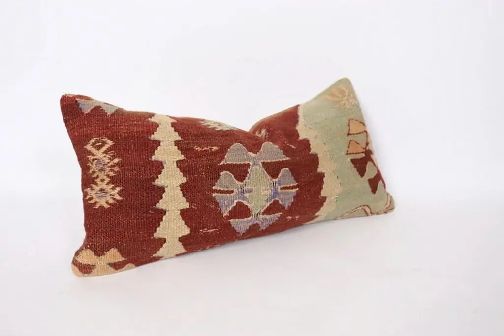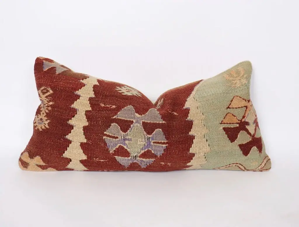 Gi hjemmet ditt et personlig og varmt preg med denne håndvevde kelimputen i 100 % ull. Putens avlange fasong gjør den ideell som støttepute i sofaen, på sengen eller i en god lenestol. De vakre fargene gir et mykt og behagelig uttrykk, samtidig som de tilfører subtil farge og liv til interiøret. Hver pute er unik og bærer preg av tradisjonelt håndverk, inspirert av klassiske kelimmønstre fra Midtøsten og Sentral-Asia. Ullmaterialet er naturlig slitesterkt og pustende, og gir både komfort og lang levetid. Kelimputer passer perfekt i både moderne og bohemske hjem, og er et flott valg for deg som ønsker å kombinere estetikk med funksjonalitet. Baksiden kommer med glidelås for enkel fjerning av putetrekket. Enten du ønsker én karakteristisk pute eller vil mikse flere i ulike fargetoner og mønstre, vil denne kelimputen i ull bli et blikkfang i ethvert rom. Kombiner gjerne med tepper og tekstiler i naturmaterialer for et helhetlig og harmonisk interiør.