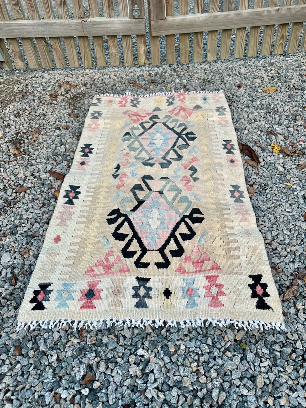 Vakkert kelimteppe i liten størrelse, 117 x 67 cm.