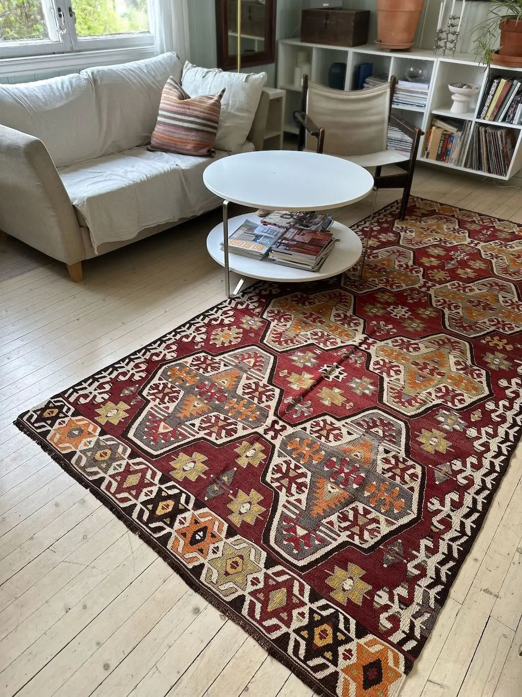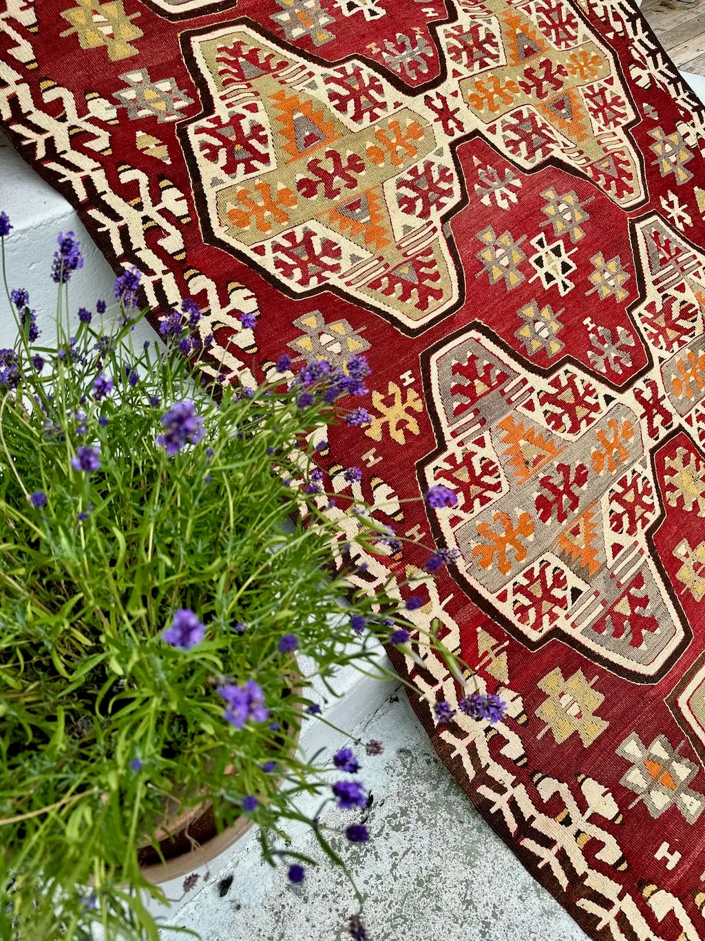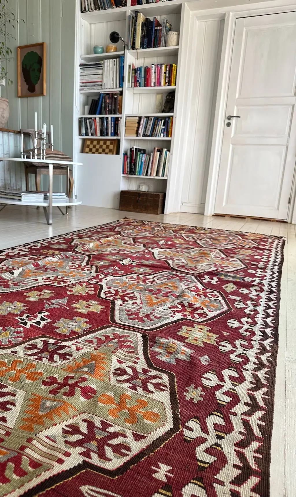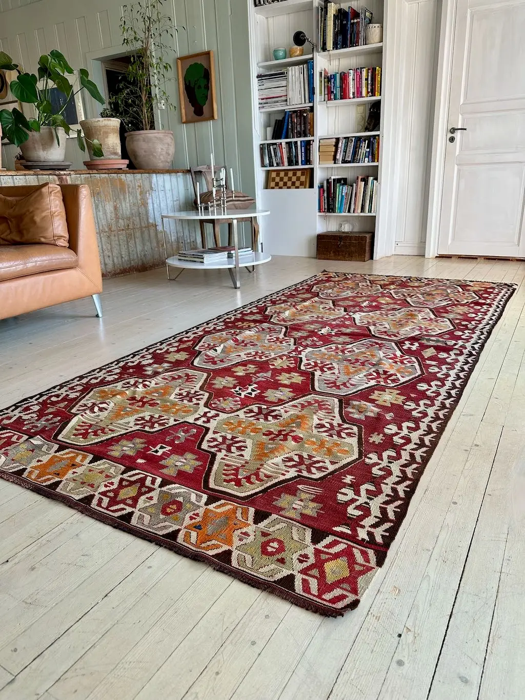 Kelimløperen er laget i slitesterk ull og bærer preg av ekte håndverk og kulturarv fra Anatolia og Sentral-Asia. Den røde fargepaletten skaper en følelse av varme og energi, samtidig som den gir rommet et personlig og tidløst uttrykk.