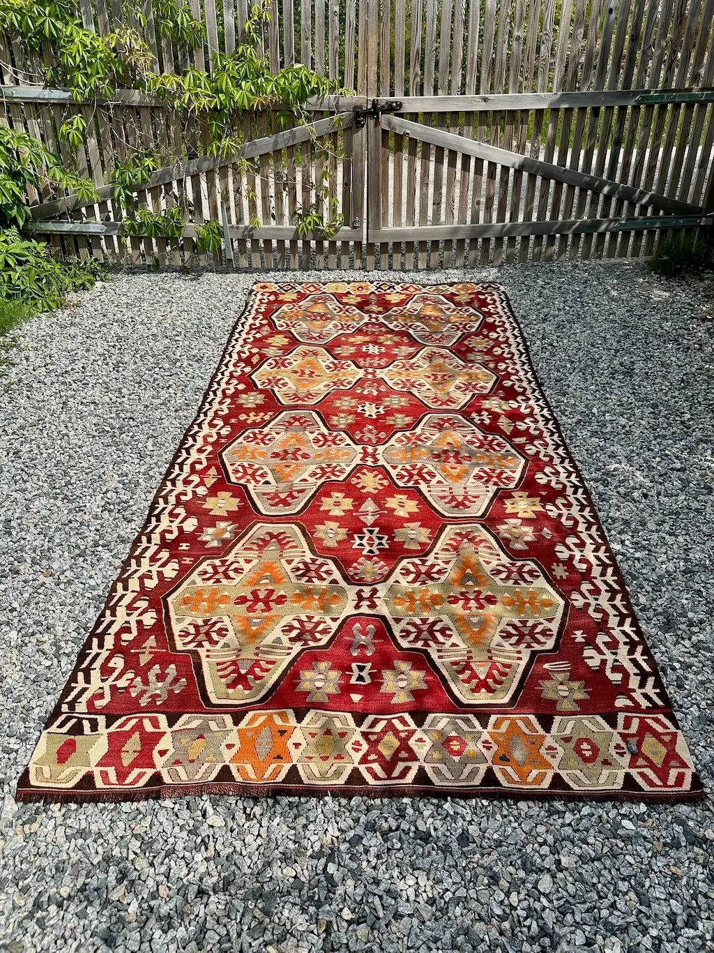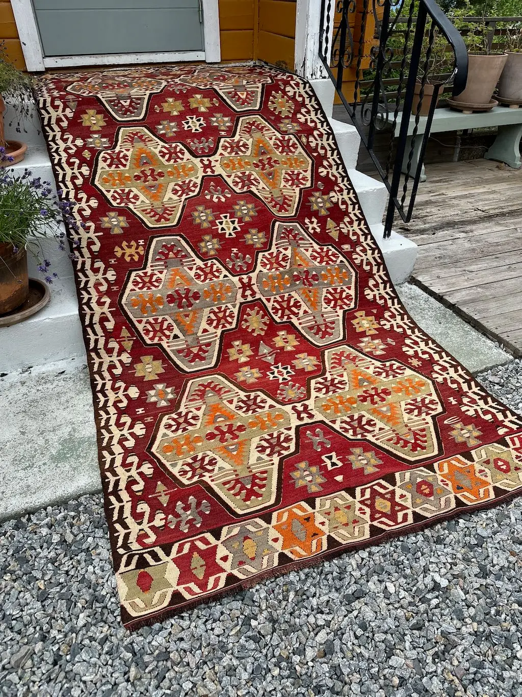 Gi hjemmet ditt et løft med denne vakre, håndvevde kelimløperen i dype rødtoner. Med sine tradisjonelle geometriske mønstre og livlige farger tilfører den både varme og karakter til ethvert rom. Den smale og avlange formen gjør den ideell i ganger, entréer eller ved siden av sengen – men den er minst like vakker som veggdekor, spesielt mot lyse, nøytrale vegger der mønstrene virkelig får skinne.
