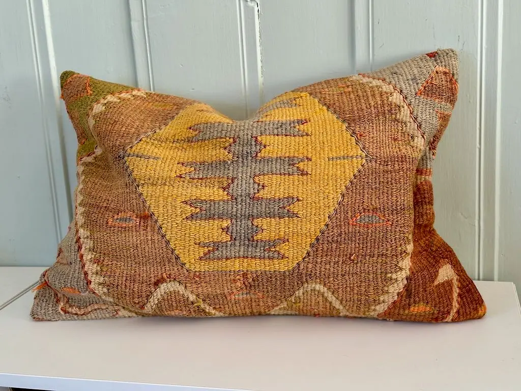 Kelimputene du finner hos oss er unike puter lagd av vintage kelimtepper med opprinnelse fra Anatolia, Tyrkia. Putene er lagd av plantefarget ull og med sitt karismatiske uttrykk vil den være et blikkfang i rommet, enten det er i sofaen, på benken i gangen eller i senga på et soverom. Puten vil fungere godt som et «statement» alene i interiøret, men det er også spennende å kombinere flere av våre puter.