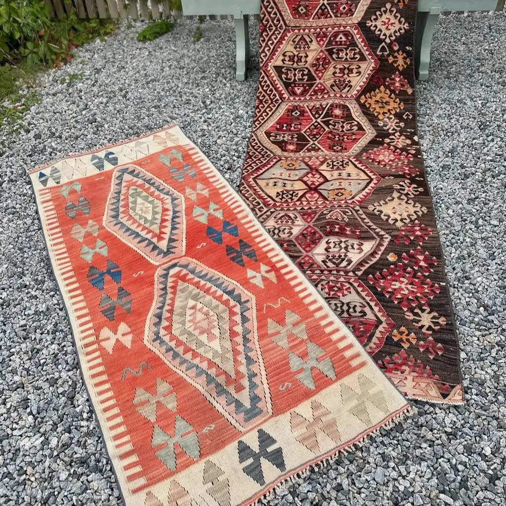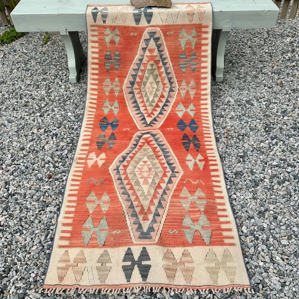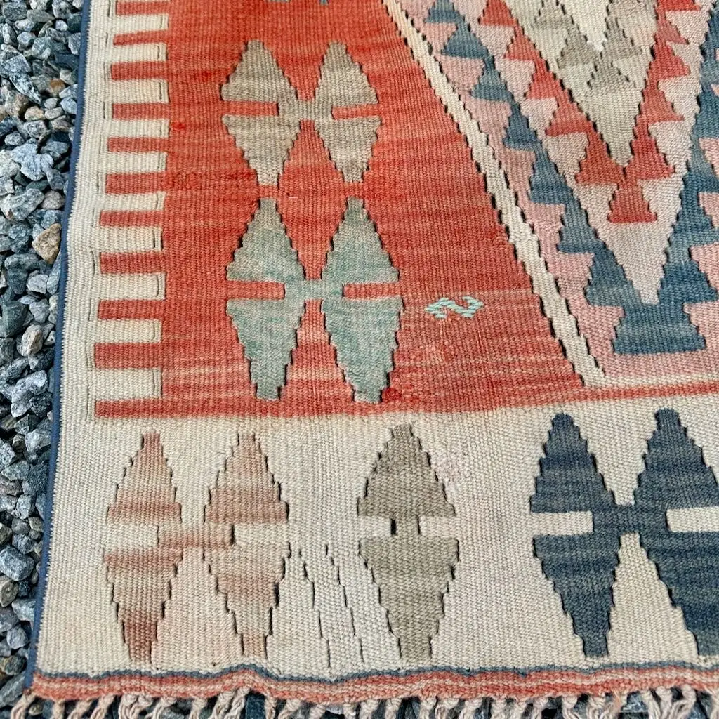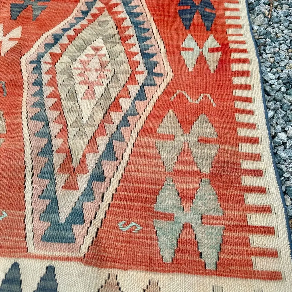 Dette er et anatolisk kelimteppe i herlige farger. Fargene i teppet vekker en følelse av ro og varme, med hint av sommer.  Teppet er vintage, som alle teppene jeg har i butikken, og det ble vevd rundt 1970. Det framstår i god stand.