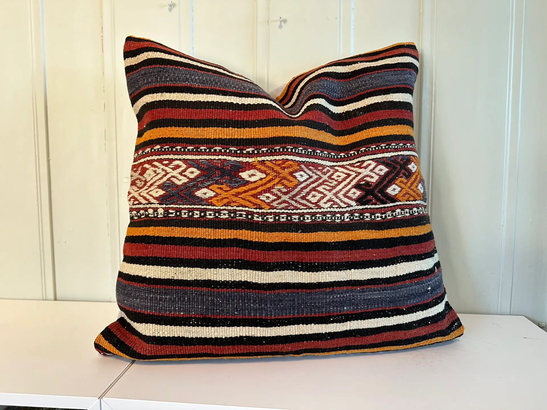 Dette er en rustikk og vakker kelimpute som er laget av plantefarget ull.  En kelimpute tilfører rommet en etnisk atmosfære og den skaper en god og varm stemning. Legg den i sofaen, på en benk eller på gulvet foran peisen. Den er vakker som etnisk tilsnitt til den nordiske stilen og tilfører rommet klasse.  Dette er et unikt produkt, så samme pute vil du ikke finne igjen andre steder.
