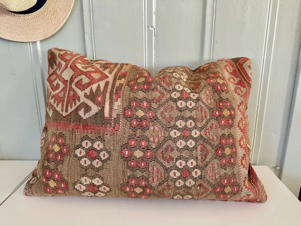 Kelimputene du finner hos oss er unike puter lagd av vintage kelimtepper med opprinnelse fra Anatolia, Tyrkia. Putene er lagd av plantefarget ull og med sitt karismatiske uttrykk vil den være et blikkfang i rommet, enten det er i sofaen, på benken i gangen eller i senga på et soverom. Puten vil fungere godt som et «statement» alene i interiøret, men det er også spennende å kombinere flere av våre puter.