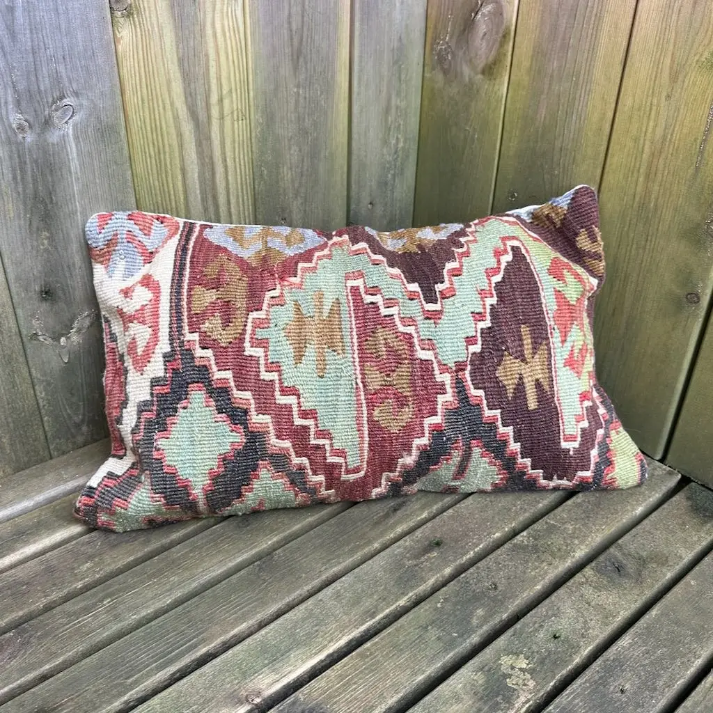 Unik kelimpute i ull, lagd av vintage kelimtepper. Kelimputen er vakker alene, men også spennende i kombinasjon med andre kelimputer. Den vil være lekker i sofaen, på en daybed eller ute i hagen. Puten lukkes enkelt med glidelås bak.